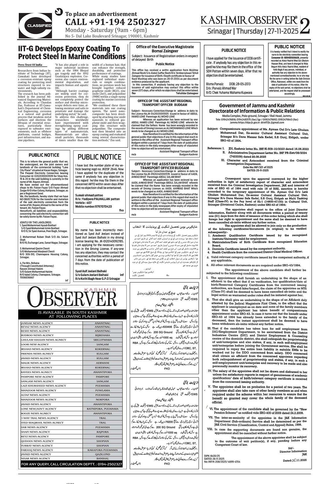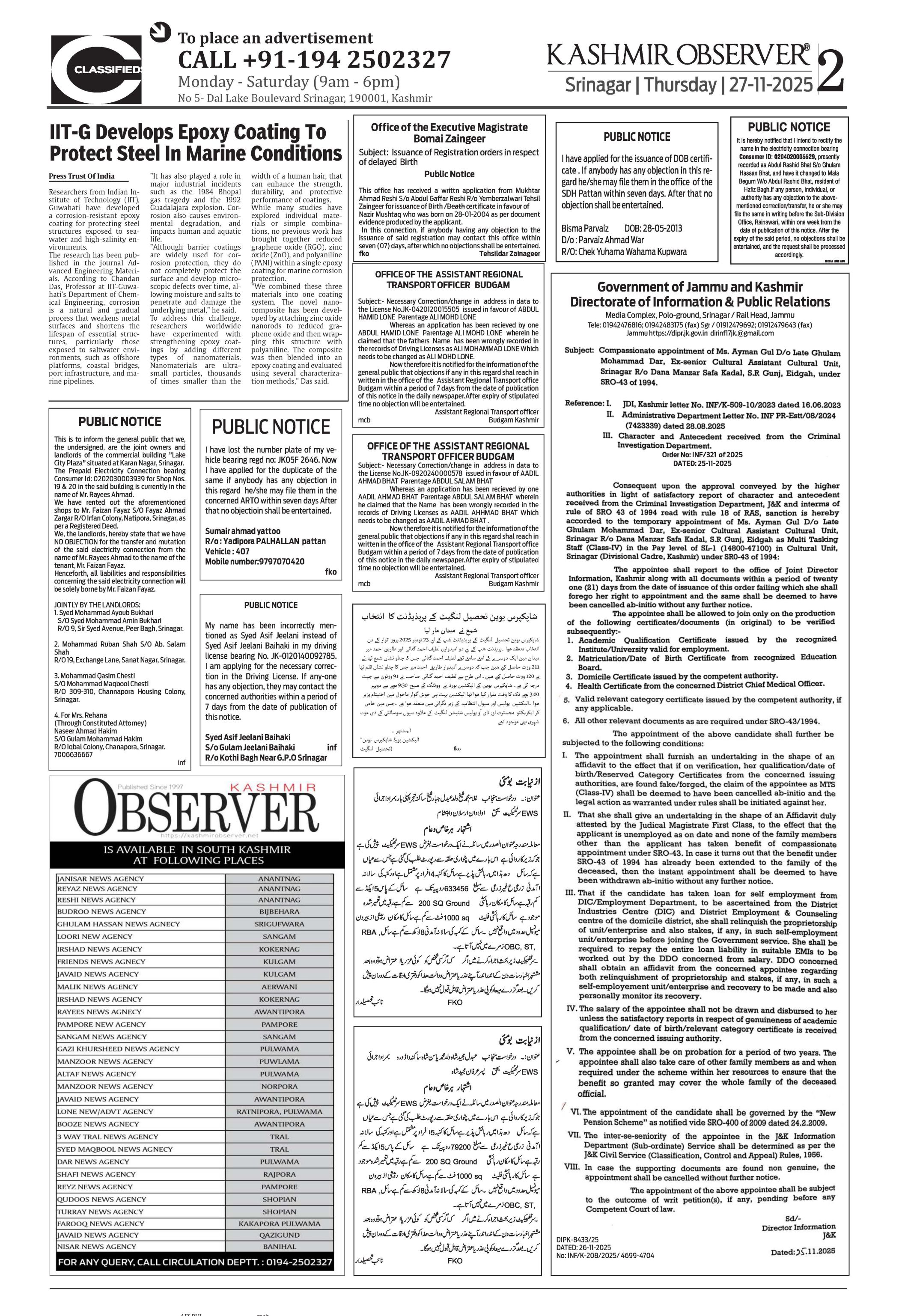 Kashmir Observer 27 Nov 2025 Page: 2
